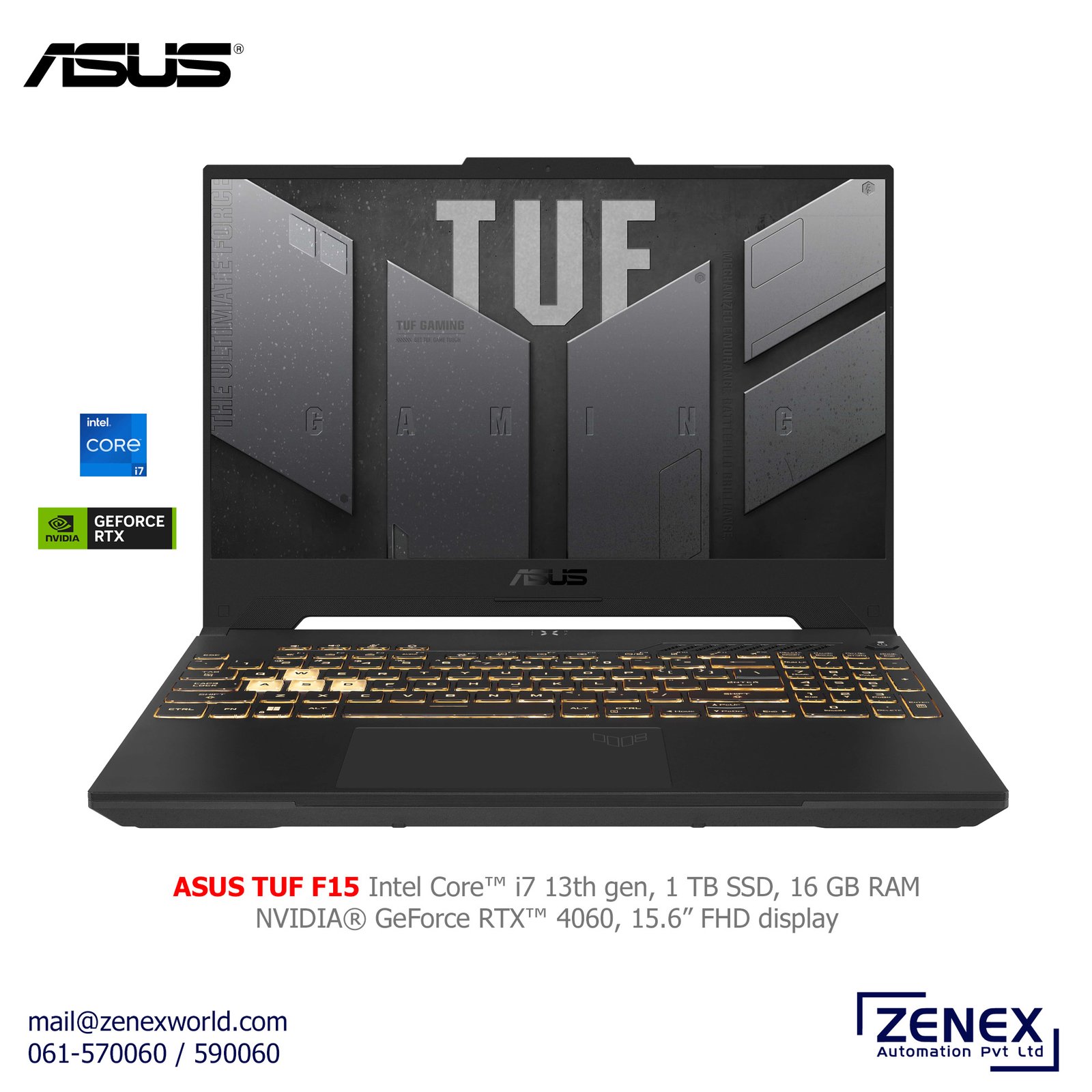 ASUS TUF F15 FX507VV4 with 13th Gen Intel Core i7-13700H Processor 2.4 GHz (24M Cache, up to 5 GHz, 14 cores: 6 P-cores and 8 E-cores), NVIDIA® Geforce RTX™ 4060 GPU graphics card with 8GB GDDR6, 16GB DDR4, SO-DIMM x 2 slot, Max Capacity: 32GB Onboard, 1TB PCIe 4.0 NVMe M.2 SSD storage, 15.6-inch Full-HD (1920 x 1080 pixels) 144Hz, 2.2 KG weight, Free Backpack and Mouse, comes with 2 Years of Warranty.